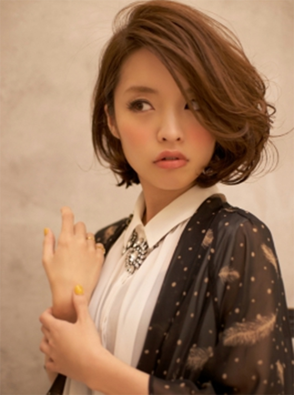 黒髪でもOKの大人エレガントな髪型(ヘアスタイル)はふんわりカールした前髪がキュート。